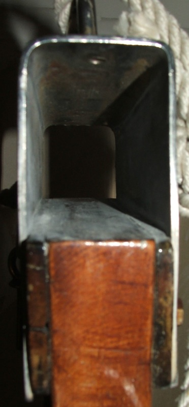 Une tôle inox en U inversé est fixée en haut de la pelle, avec des cales, pour créer une surépaisseur. Une poignée en inox est vissée sur le sommet de la tôle en U, de sorte que le safran posséde une préhension et, une fois encore, un moyen de l’assurer au bateau.