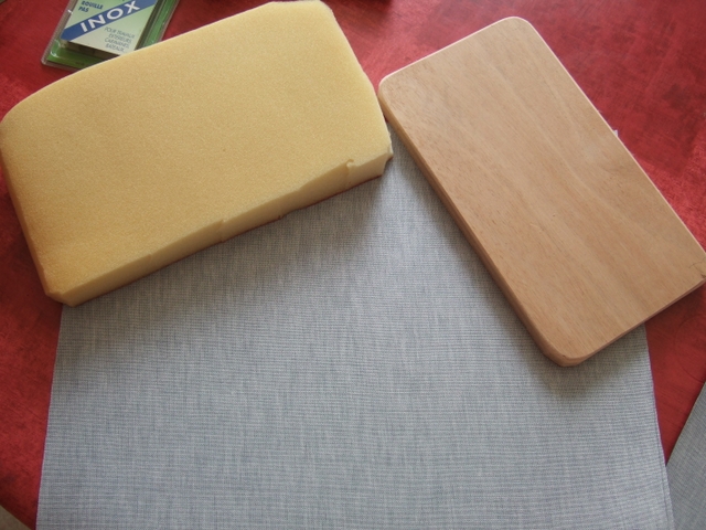 Maintenant ce n’est plus qu’un jeu d’enfant. Il faut juste centrer la planchette et la mousse sur le tissu et d’assembler le tout avec les agrafes inox. Voici le début de l’assemblage :