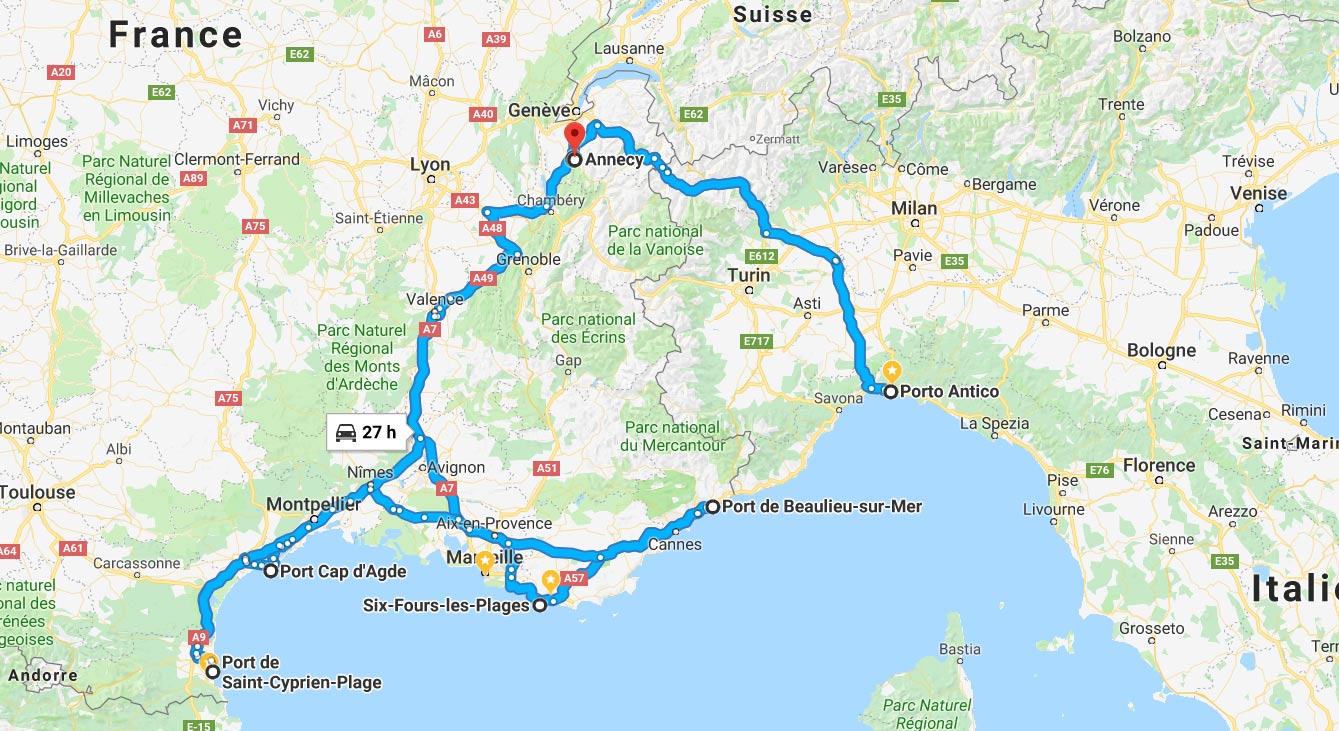 Rare sont les cas où vous trouvez plusieurs annonces de bateaux à vendre dans un même secteur géographique. Du fait des coûts des déplacements (essence, péages, hébergement…) il faut essayer, quand c’est possible, de regrouper les visites. C’est ce que nous avons tenté de faire durant 1 semaine durant laquelle nous avons enchaîné les kilomètres et parcourus toutes les côtes Française de la Méditerranée soit environ 1800 km A/R pour la première partie des visites (Toulon – Beaulieu-sur-mer – Cap-d’Agde – Saint Cyprien), jusqu’en Italie (Gênes) pour la deuxième partie des visites. Autant dire que les visites de bateaux doivent êtres prises en compte dans un budget d’acquisition et prévoir du temps en déplacement. Voilà les trajets réalisés pour les visites. Ceux réalisés sur Gênes (3 x 796 km A/R) ne sont représentés qu’une fois ?