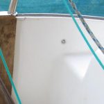 Fixée avec 2 boulons par platine (impératif), pas besoin de contreplaque vu l’épaisseur conséquente du tableau arrière!Vue du cockpit, on voit ici le boulon du haut de la platine tribord. Le boulon du bas est dans l’angle de la jonction banc/tableau, accessible par le coffre.